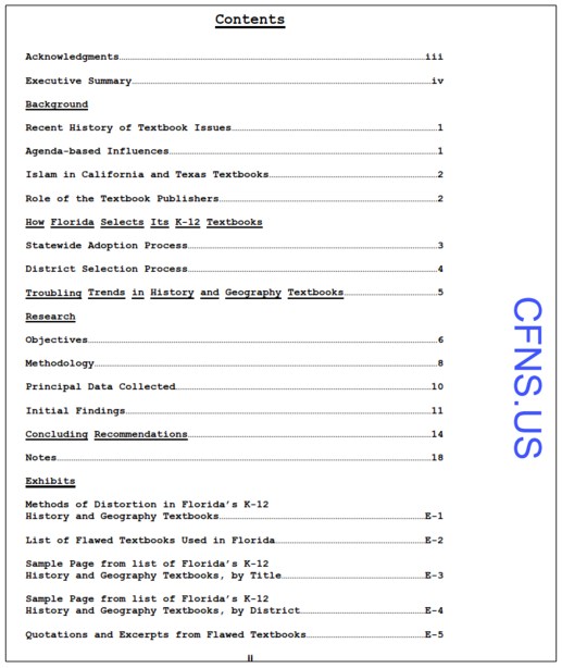 In mid-2008, Citizens for National Security – a Florida nonprofit, 501(c)(3) Public Charity – assembled a volunteer Task Force to learn about and evaluate Islamic efforts to exert their influence in Florida’s public schools. In this initial report, CFNS focuses exclusively on “flawed” K-12 history and geography textbooks. Flawed textbooks are defined, within the context of this study, as those that include egregious errors, glaring omissions, questionable inclusions,