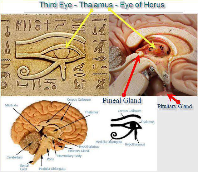 pineal-gland-eye-of-horusThe Pineal Gland is an actual, physical gland housed within the brain. You can see in the image that a cutaway of part of the brain that houses the Pineal Gland that it resembles an eye. In Ancient Egypt, this gland was thought to be the Eye of Horus.