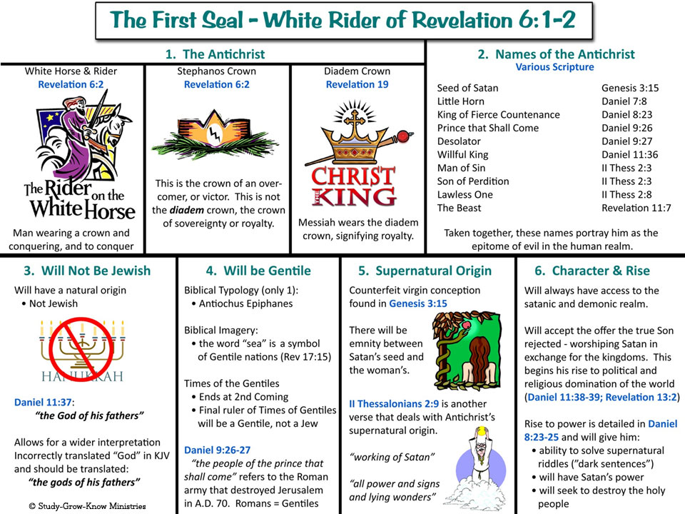 The Tribulation begins with the covenant and that is the same event that reveals him to the world, according to Revelation 6:1-2. The First Seal revealed to us is the Rider on the White Horse. This Rider is believed by many to be the Antichrist though some believe it to be Jesus Himself. The problem with interpreting the First Seal as Jesus is that the question must be asked, why would He come at the beginning of the Tribulation when He obviously comes at the end? Are the seals out of order? No, as you’ll note from the chart I’ve created, this particular rider is on a white horse, which signifies peace.