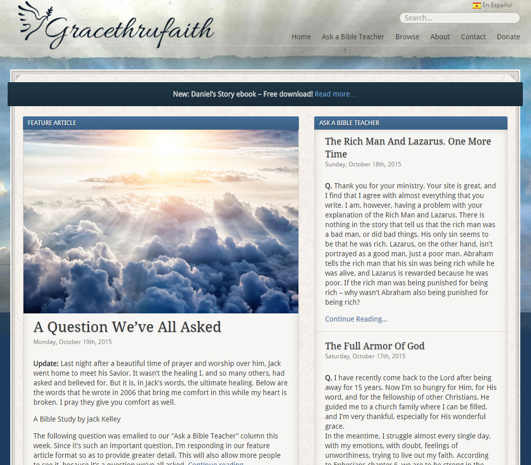 gracethrufaithheaderNot sure how many of you may be aware of Jack Kelly or the ministry he began called “Grace Thru Faith.” If you are not aware, though he has passed onto eternity, his ministry is still in effect. Grace Thru Faith was/is a Q & A type of ministry where folks would write in with questions and he would answer them. He, along with his family, lived in Baja Mexico where they were volunteer missionaries.