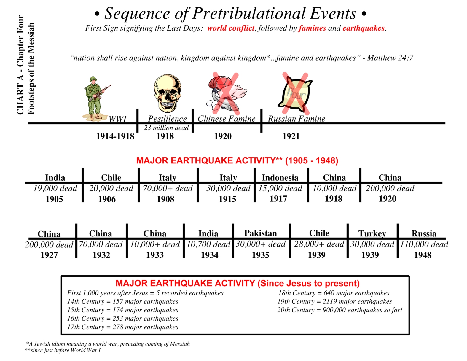 I’ve included a couple of charts I created for this series. The one above highlights the connection between the global conflicts of both WWI and WWII and the resultant earthquakes and famines. The second one – just to the right – highlights the 9 birth pangs that are predicted in Scripture that will take us up to the very end of this age. As stated, we dealt with the first pang last time, global conflict.
