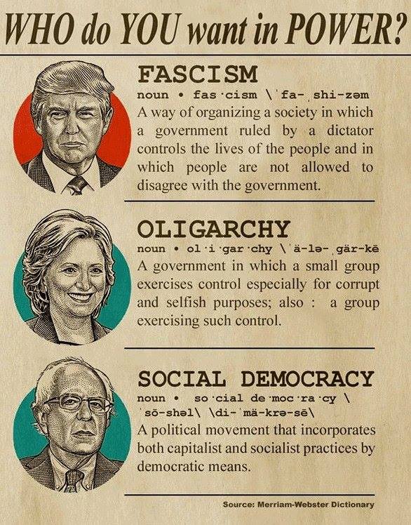 Here’s the other image I want to share. Whether or not you agree with the characterization of each person highlighted, the fact remains that this is the way some people see them. You can probably figure out which group created that pictorial meme, I’m sure. First of all, is Trump a “fascist”? Is Clinton part of the oligarchy? What about Bernie and his alleged Social Democracy?