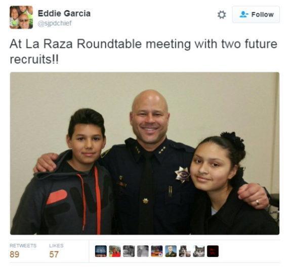A photo alleged to be from Chief Eddie Garcia’s own Twitter account showing his participation at a local La Raza event. This tends to make people believe he is for one race above all others. As chief of police, he needs to distance himself from these racist groups, not participate with them.