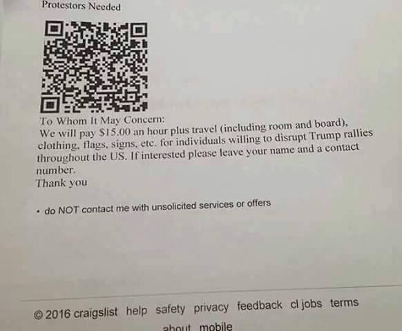Alleged authentic ad on Craigs List seeking people who were willing to disrupt Trump rallies for money.