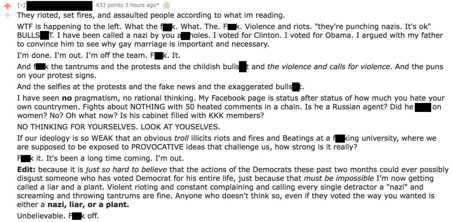 One individual recently posted on his social network that because of the violent nature of the left, he has finally seen the light and understands the Democratic Party for what it is and he is done. I’ve taken the liberty of posting a screenshot of his rant (minus the expletives). You can feel his disgust for what are the “tantrums” of the far left.
