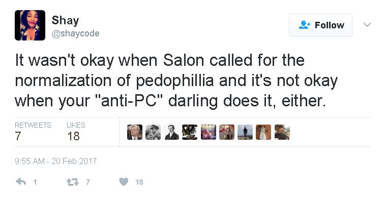 As just one example, the individual in the graphic points out that when Salon (a leftist media bureau), gave the okay to pedophilia, it was wrong just as Milo’s current views are wrong. While I agree with her, I don’t recall people on the left condemning Salon for their op-ed. Maybe it happened, but it was not generally stated by the left at all. In fact, I firmly believe that if Milo was not a conservative (politically), but a fascist leftist, his views would be welcomed at UC Berkeley and everywhere else the left holds dear.