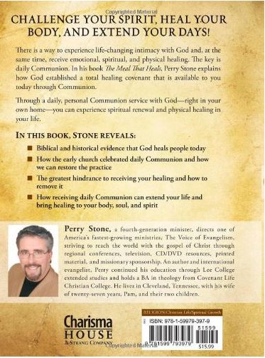 The book The Meal that Heals deals with the Lord’s Supper and Stone’s claim that by partaking of that meal, you will actually start healing your body. A quote from the description of the book reads like this: