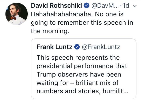 One person on the Anonymous boards posted this image of David Rothschild’s response to President Trump’s State of the Union Address, which to me, is very intriguing. Notice all the “ha ha’s” there as well. For those who know, the Rothschilds are one of the biggest threats to humanity, if not the biggest. That one family has done more to enslave the world than any other family. The Rothschilds are at the very top of the pyramid so to speak. They control the money markets. They control the big banks.