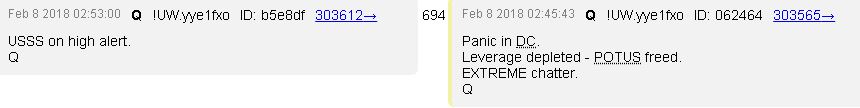 A big shout out to the people on the Anonymous board for their untiring work to decipher these Q drops. I sit amazed at how much they plow through things in order to finally get to some point where things began to at least appear to make sense. As seen in the image, two posts by Q on February 8th simply say, “Panic in DC. Leverage depleted – POTUS freed. EXTREME chatter. Q” and then shortly after that, “USSS on high alert. Q.” We briefly highlighted those in our last Q posting. Honestly, the meaning is up for grabs. It is generally assumed that “USSS” refers to the US Secret Service, but President Trump does not use the Secret Service ever since he learned that they could not be trusted. Apparently, there was a kidnapping in the works against Donald Trump Jr.’s children that would work against President Trump (leverage), so both Trumps released their Secret Service group and POTUS is kept secure by military and his own armed security. This is where JFK went wrong. He continued to use the Secret Service instead of the military for protection. Regarding the rest of the posts, it is really difficult to discern.