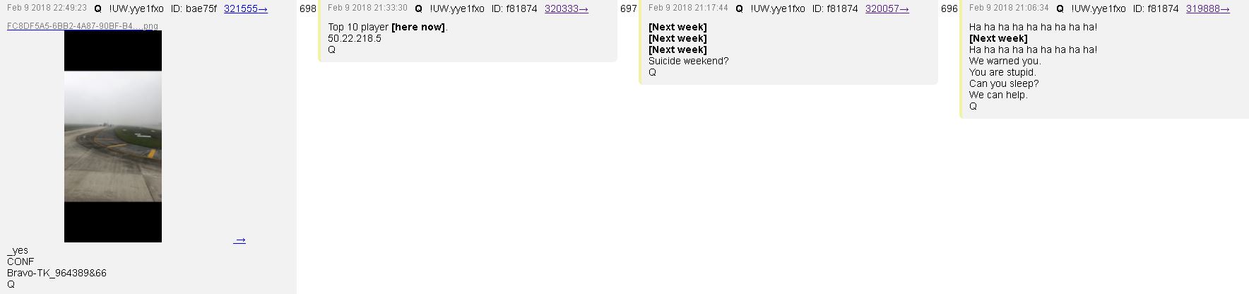 February 9th provided four posts by Q and again, they are very cryptic as you can see. The order of the posts goes from right to left, with the earliest post being on the far right. You’ll agree that it’s very cryptic? Thanks to Anonymous, there are some very real possibilities here. Note the number of “ha ha’s” in Q’s post. Note Q repeats [Next Week] several times in these posts from the 9th. He is clearly saying that something bigly is going down this coming week. What can it be? He also states “Suicide weekend?” Is he talking about political suicide or physical suicide? Unknown at this point.
