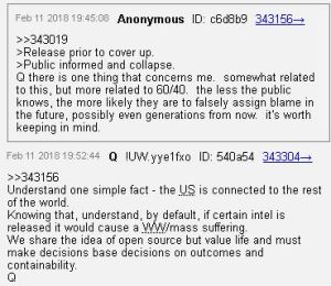 This comment obviously means that people who go to the boards to view these conversations and info are not just average people like you or me. It’s very likely that CIA people go there, and people from Big Pharma or even Big Foods. His next post seems to confirm that when he says, “Chatter amongst those in control has begun. They know we know which means the public will know. Release prior to cover up. Public informed and collapse. Which option? Q.”