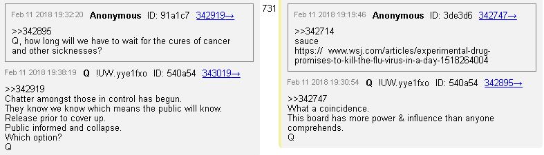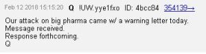 One of Q’s posts about Big Pharma is shown here on the right. It’s actually two posts. The first on the far right is in response to an Anon post citing a link to an article discussing an experimental drug that could kill a flu virus in one day. Imagine that. Q’s response? “What a coincidence. This board has more power & influence than anyone comprehends. Q.”