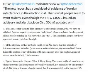 The truth appears to be that not only this most recent general election was seriously compromised, but as Powell states, it appears that it goes back to 2016 in the primaries when this same hijacking of votes occurred to favor Hillary Clinton over Bernie Sanders. Apparently, Powell also has a great deal of proof that many smaller (state and local) elections were also compromised across the USA in previous elections.