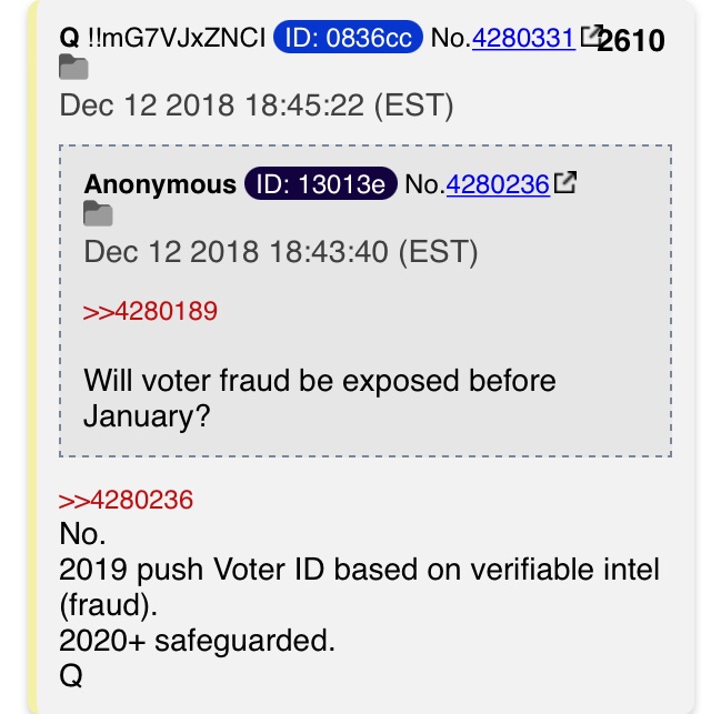 In all this, I’m reminded of several things. First, recall that the mysterious Q had posted several things about voter fraud way back in 2018. Note that in this image, Q responds to a question posed by an “anon” (anonymous person). As you can see, the person asked, “Will voter fraud be exposed before January?” The poster was referring to January of 2019.