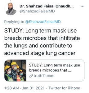 Our friend Dr. Shahzad highlights a study that confirms long term mask use breeds microbes that can ultimately cause advanced stage lung cancer. We knew that wearing masks all the time was not healthy, but people have gotten into the habit of wearing them, they make their kids wear them and also wear them by themselves in their cars. It’s more than unhealthy. Masks can be deadly, but again, CDC wants us to wear TWO. Surely, they must be aware of this study?