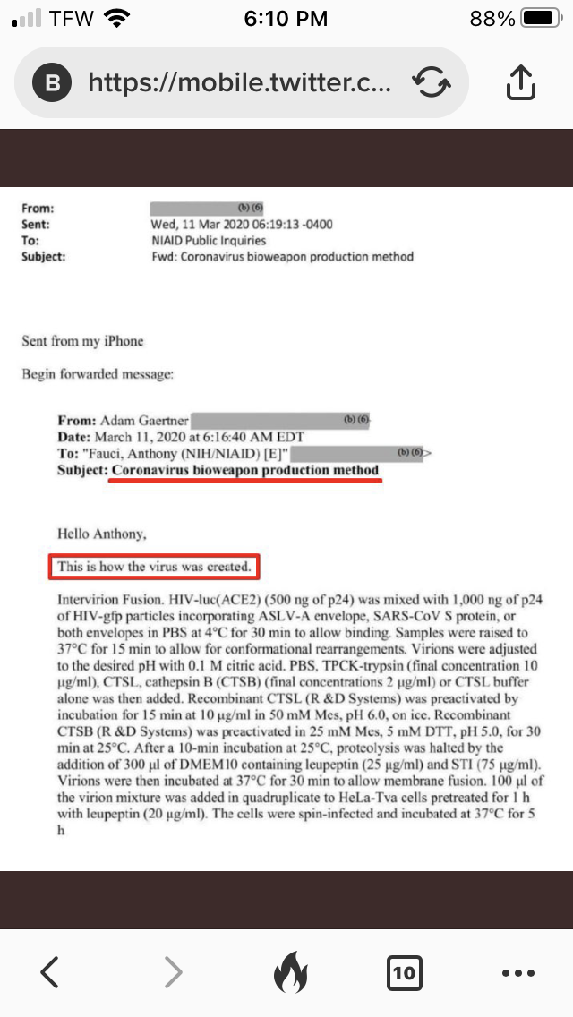 In one very shocking email (pictured dated March 11, 2020 yes, 2020), we learn how the CV-19 virus was created. Notice the very first line of the email from a person whose name has been redacted. They used HIV to create it. Now unless this particular “HIV” refers to something else entirely, it most likely refers to the human immunodeficiency virus, which causes AIDS and is usually fatal. This is the recipe used to create CV-19 designed to kill or harm people and create havoc throughout the world. At the same time, this could all be smoke and mirrors, who really knows? Maybe Fauci is being sacrificed and blamed? What’s coming?