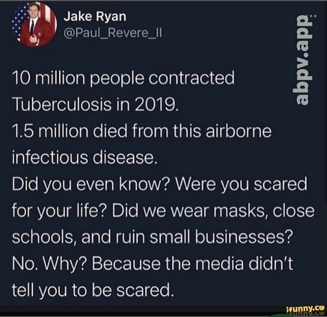 Yet, were we told to do any of these things during any previous flu season or previous pandemic like H1N1? Were we this concerned about catching tuberculosis in 2019 when 10 million people contracted it and 1.5 million died from it? Most weren’t even aware of it because the MSM didn’t tell us about it and wasn’t ginning up the fear of it 24/7/365.