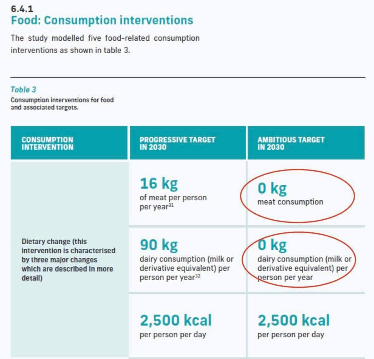 Notice that the progressive target for meat consumption is 16 kg per person per year by 2030. The ambitious target for the same category is 0 kg per person by 2030. Notice also that regardless of the target – progressive or ambitious – the caloric intake per person remains at 2,500 calories per day. So that means that fake meat or other food like substances will be available to people, but not real meat or real food.