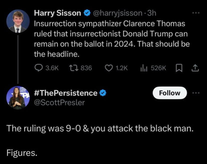 In spite of this clear and obvious ruling, the Left went berserk. Harry Sisson (a nobody on X who has a large following and would not surprise me to learn he is a paid troll of the Left), proves his racism as well as his inability to think critically with a tweet he posted on his timeline yesterday.