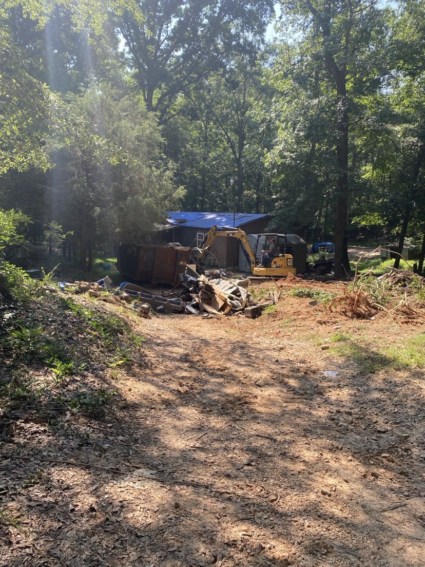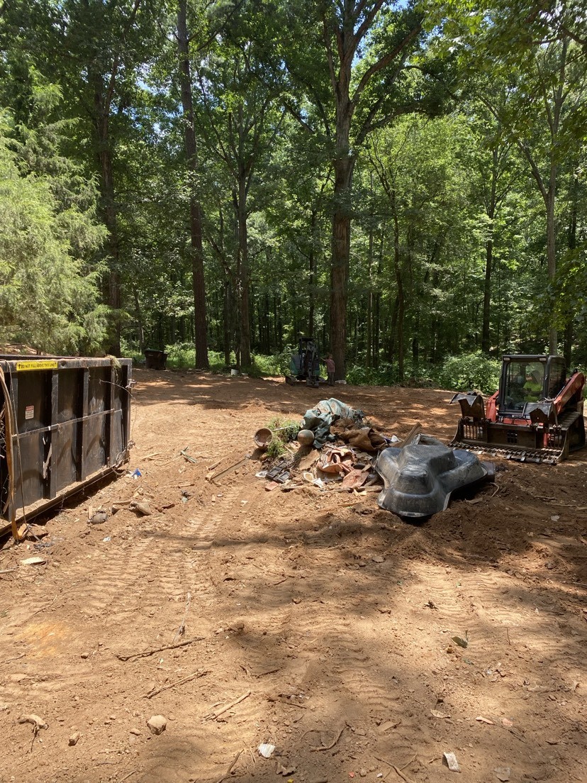 I began moving around the area, picking up piles of junk and dropping it all into an onsite roll-away dumpster with the excavator I was driving. When the dumpster would fill up, it would be removed and replaced with another one. We also graded dirt to try to flatten and grade the area for the placement of the new mobile home and to get the rainwater to run away from the mobile home.