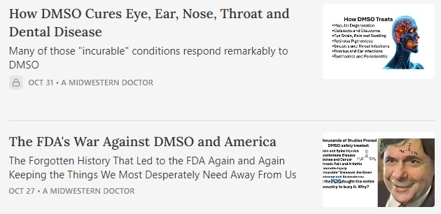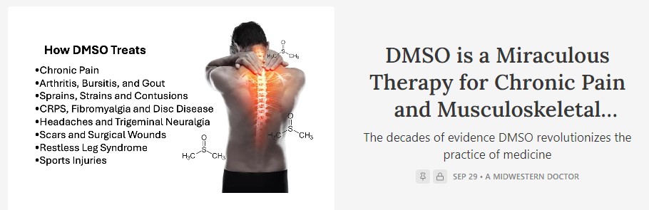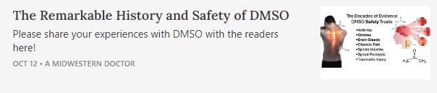 The more I read about DMSO and it’s potentially healing properties, the more intrigued I became. I bought several books on it and also began reading numerous online articles written by medical professionals. The substack Midwestern Doctor, who writes The Forgotten Side of Medicine, offers numerous articles on DMSO and what he believes to be its benefits.[1] His articles are well worth the read because he offers plenty of documentation and footnoting for what he highlights.