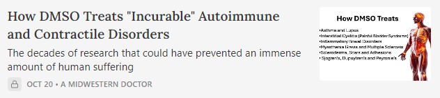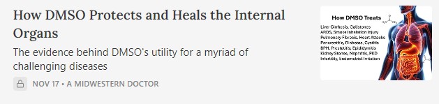 Both books as well as Midwestern Doctor’s substack, discuss using DMSO externally as well as internally. Interestingly enough, once this product came to the fore, Big Pharma tried to jump on it, to claim it as its own. There were issues though (like that garlic odor), that slowed the process. Eventually, as stated the FDA refused to clear it for general use. I have to wonder though if that was done at the behind-the-scenes behest of Big Pharma because of DMSO’s potential curative nature? I don’t know. I’m simply asking the question.